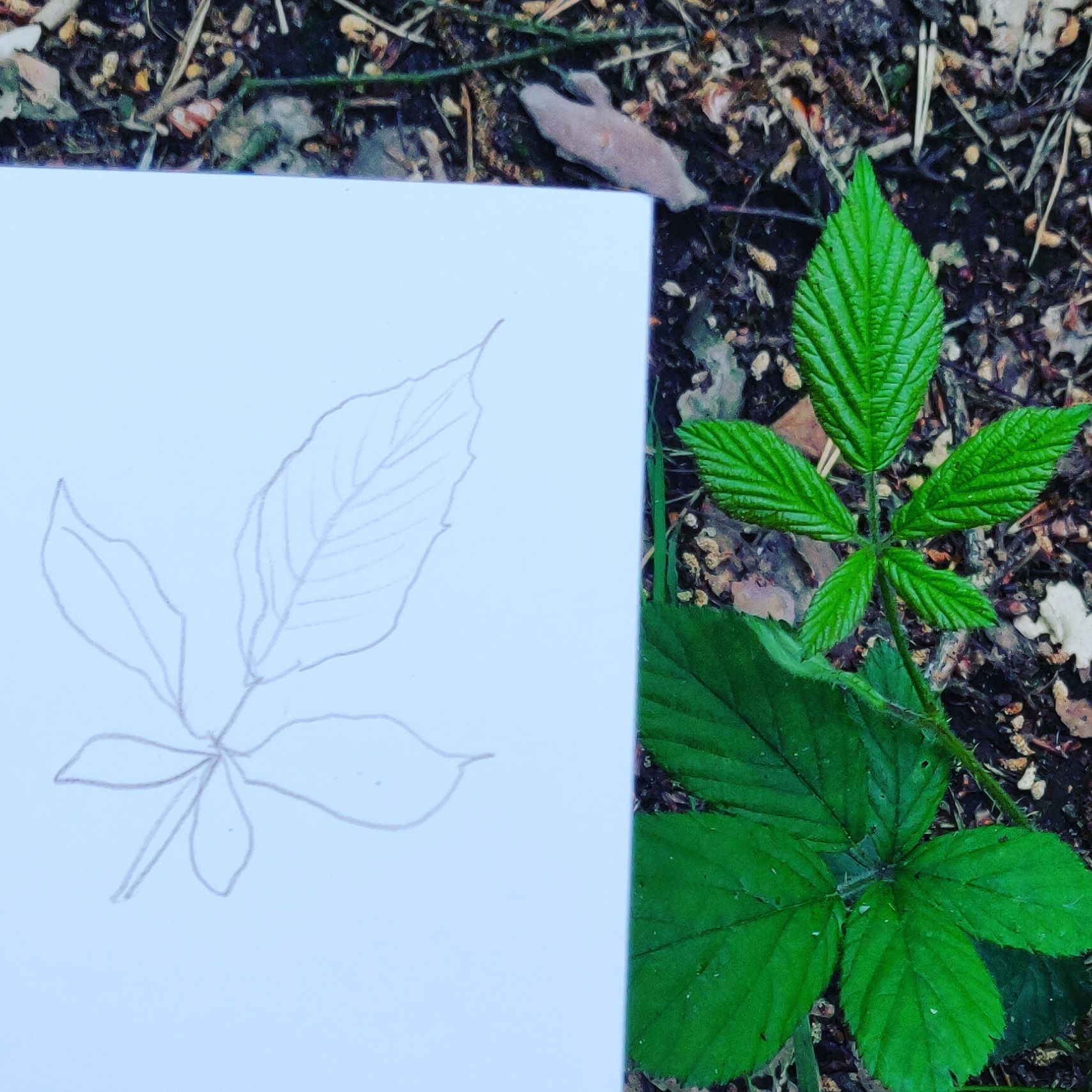 Als ik dan eindelijk bij mijn eigen gedachten kan komen door de natuur op te zoeken is de beste oefening om die aandachtspier te gebruiken iets natekenen. Gewoon iets kleins. Een eikel, een boomblad, de uitloper van een takje van een boom, een bloem, een steen. Zodra je buiten bent is er een schat aan natekenmateriaal. Maak het vooral niet te groot, maar houd het behapbaar. Het is niet de bedoeling dat je overweldigd wordt, maar precies genoeg uitgedaagd. En zelfs iets simpels als een eikel. Waarbij je wellicht denkt dat het heel simpel is om na te tekenen. Kijk maar eens goed naar de lichtval. Hoe loopt de schaduw waardoor je ziet dat het rond loopt? Welke lijnen en structuur zie je?